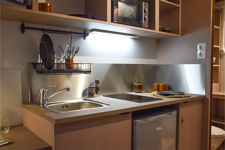 > Une cuisine avec évier inox, plaque de cuisson à induction 2 feux, un réfrigérateur table top 114L, un plan de travail stratifié et crédence inox angle, une étagère et un égouttoir vaisselle