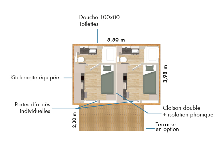 Le Casa 19 Duo est la solution idéale pour répondre à des besoins d’hébergement temporaire. Grâce à son agencement optimisé, il accueille confortablement deux personnes indépendantes avec une salle de bain partagée tout en restant compact et facile à transporter. Son installation rapide sur des terrains vacants ou en attente de projet permet de disposer d’un logement fonctionnel en quelques heures seulement.
