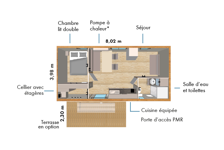 La pièce de vie est composée d’une cuisine équipée, d’une table avec banquette, des meubles de rangement et un emplacement TV.